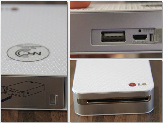 Öffnung für das Photopapier Oben: USB- & Ladekabel