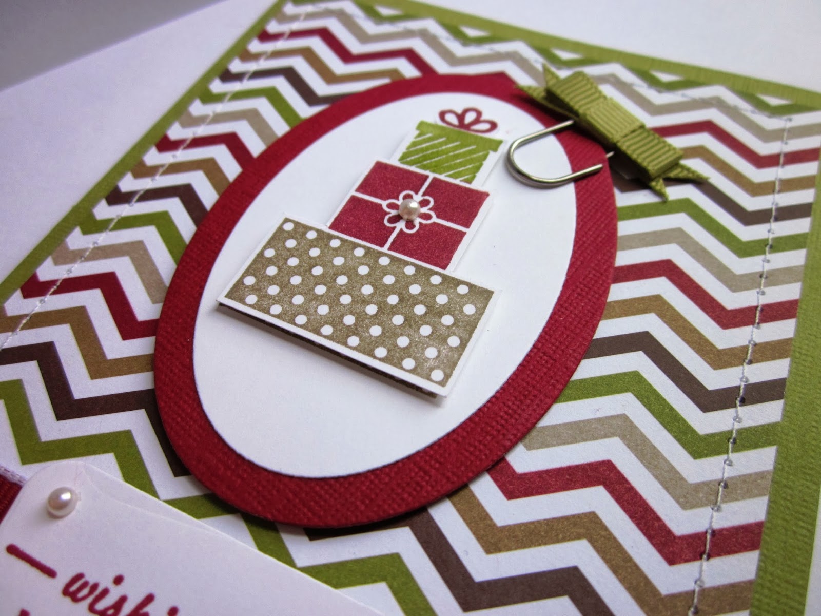 Die Ovale sind auch Framelits (Ovale Kollektion) und erst habe ich auf das flüsterweiße Oval gestempelt und dann nochmal die Geschenke ausgeschnitten drübergeklebt. Eingefärbt mit den Markern in Savanne, Chili und Olivgrün.