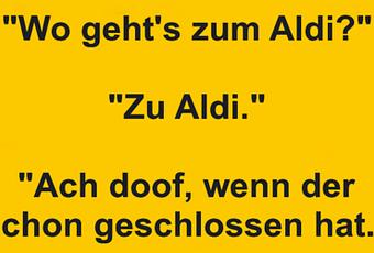 Auf Facebook teilen Vorige Folgende "Wo geht's zum Aldi?" "Zu Aldi." "Ach doof,... Autor des Artikels : istdaslustig Zum Original-Artikel "Wo geht's zum Aldi?" "Zu Aldi." "Ach doof, wenn der schon geschlossen hat." Hier geht es zum Artikel Mehr Lustiges auf www.istdaslustig.de Auf Facebook teilen Vorige Folgende Das könnte Ihnen gefallen Mehr