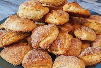 Den ausgerollten Teig in Quadrate schneiden. Jedes Quadrat in Zucker wälzen, dann zusammenfalten. Wieder wälzen, wieder zusammenfalten und nochmal in Zucker wälzen.