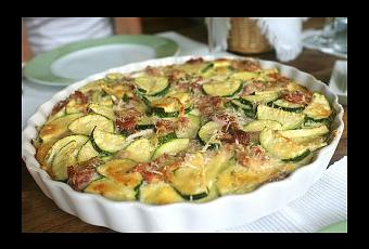 Heute gibt es mal wieder Zucchini. Und zwar aus dem Ofen und mit einer feinen italienischen Note versehen. Wie die meisten meiner Gerichte ist es nicht aufwendig und trotzdem lecker. Es lässt sich auch prima vorbereiten, so dass man es nur noch in den Ofen schieben muss, wenn zum Beispiel die Gäste da sind. Viele Zutaten braucht man für diesen Zucchini-Auflauf nicht, aber die sollten dafür auch von richtig guter Qualität sein. In diesem Falle heißt das: die Zucchini vom Bauern am Marktstand, frische Kräuter, lange gereiften Parmigiano und Schinkenspeck vom Bio-Metzger. Kostet vielleicht den ein oder anderen Euro mehr, aber das schmeckt man dann auch – glaubt mir!