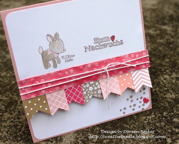 Für diese Karte habe ich unsere neue Fähnchenstanze genommen und allerlei Designpapierreste verwertet! Die geprägte pinkfarbene Bordüre habe ich noch ein bissel mit flüsterweisser Stempelfarbe gewischt!!