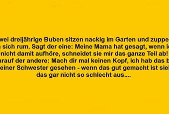 Zwei dreijährige Buben sitzen nackig im Garten und zuppeln an sich rum. Sagt der eine: Meine Mama hat gesagt, wenn ich nicht damit aufhöre, schneidet sie mir das ganze Teil ab! Darauf der andere: Mach dir mal keinen Kopf, ich hab das bei meiner Schwester gesehen - wenn das gut gemacht ist sieht das gar nicht so schlecht aus....