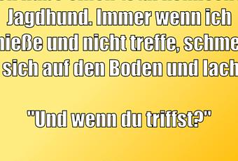"Ich habe einen total komischen Jagdhund. Immer wenn ich schieße und nicht treffe, schmeißt er sich auf den Boden und Iacht."